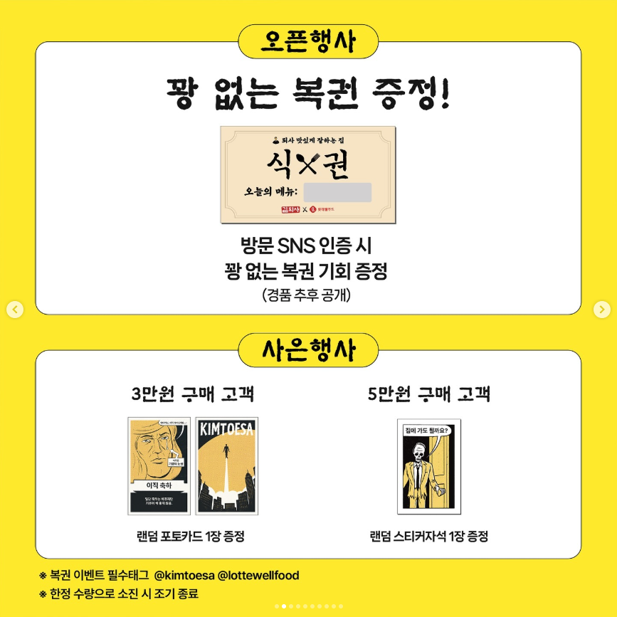 - 방문 SNS 인증 시 꽝 없는 복권 기회 증정 (@kimtoesa @lottewellfood)