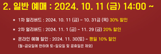 티켓은 네이버와 예스24에서 구매가 가능합니다. 다만 예스24 표 매수가 네이버와 연동되는 시스템이라서 예스24에서 이미 매진일 경우 네이버에서도 구매가 불가능합니다. 2차 얼리버드는 11월 29일까지 입니다.